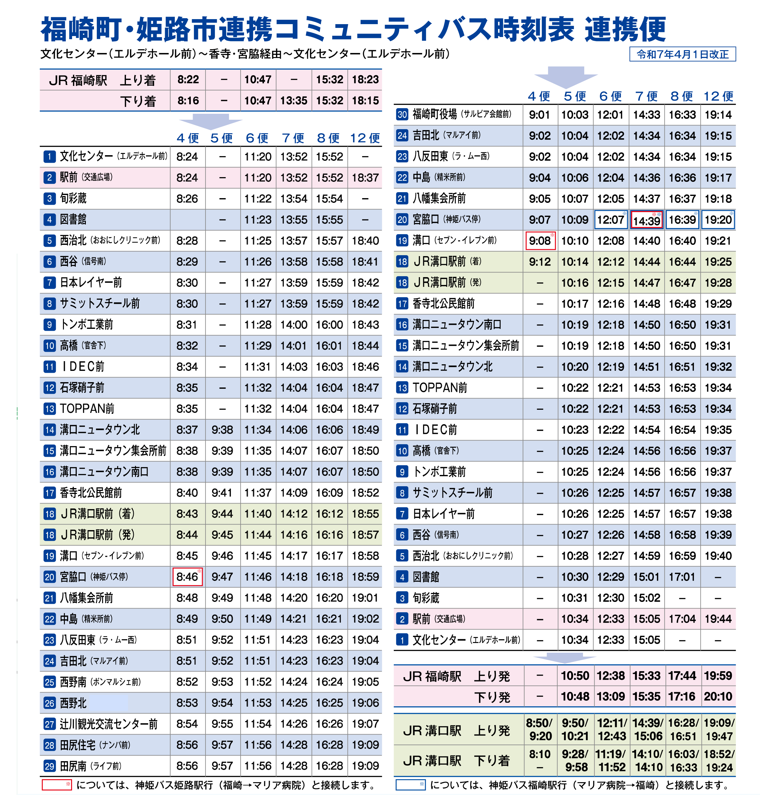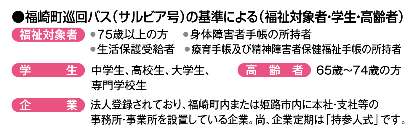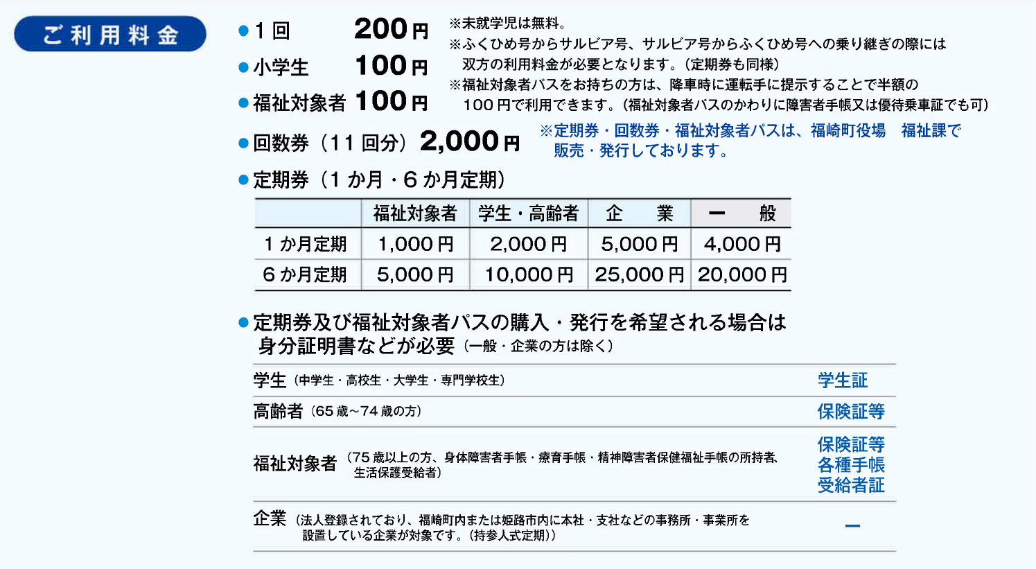 ふくひめ号は、福崎町と姫路市間を運行するコミュニティバスで、社会実験運行を経て、令和3年4月1日より本格運行を行っています。 ふくひめ号は、「福崎町・姫路市の公共交通空白地域の解消」「JR播但線の利用促進」「企業の雇用確保」「障がい者就業支援」など多様な地域ニーズに対応するために運行しています。