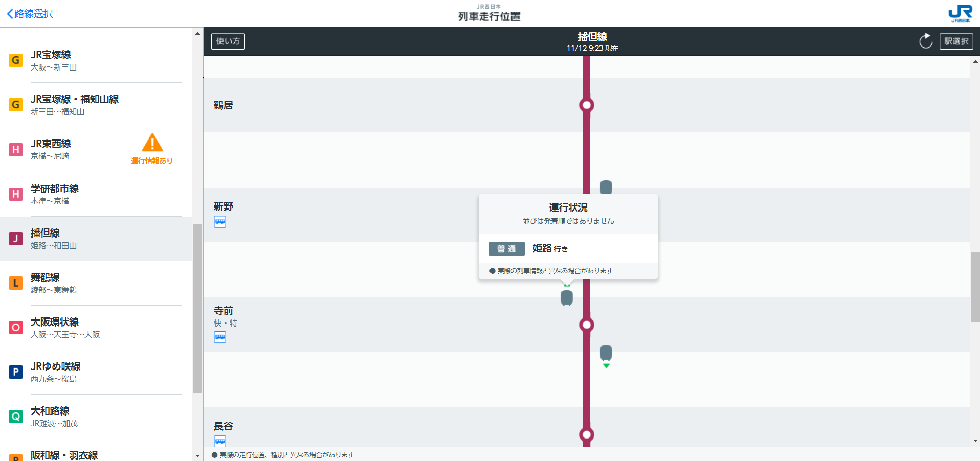 JR西日本管内の在来線列車の在線位置情報及び個別列車の遅延等運行に関する情報を以下の「JR西日本 列車走行位置サービス」でご覧いただけます